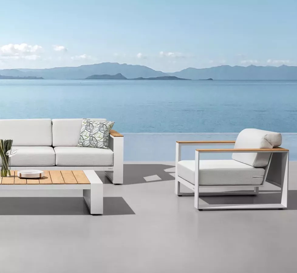 Coloris : Aluminium : Blanc / Coussins : Gris / Bois : Teck