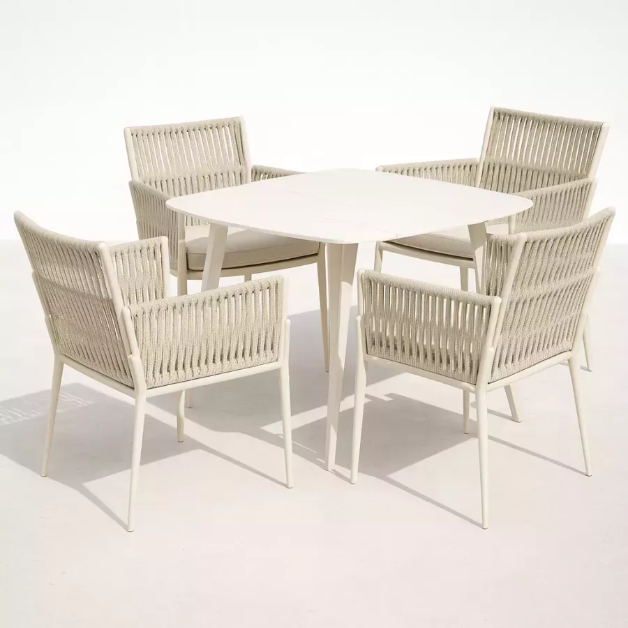 Fauteuils de table HASTIA – Aluminium beige & corde tressée beige avec coussin | Mobilier extérieur design Côte d’Azur