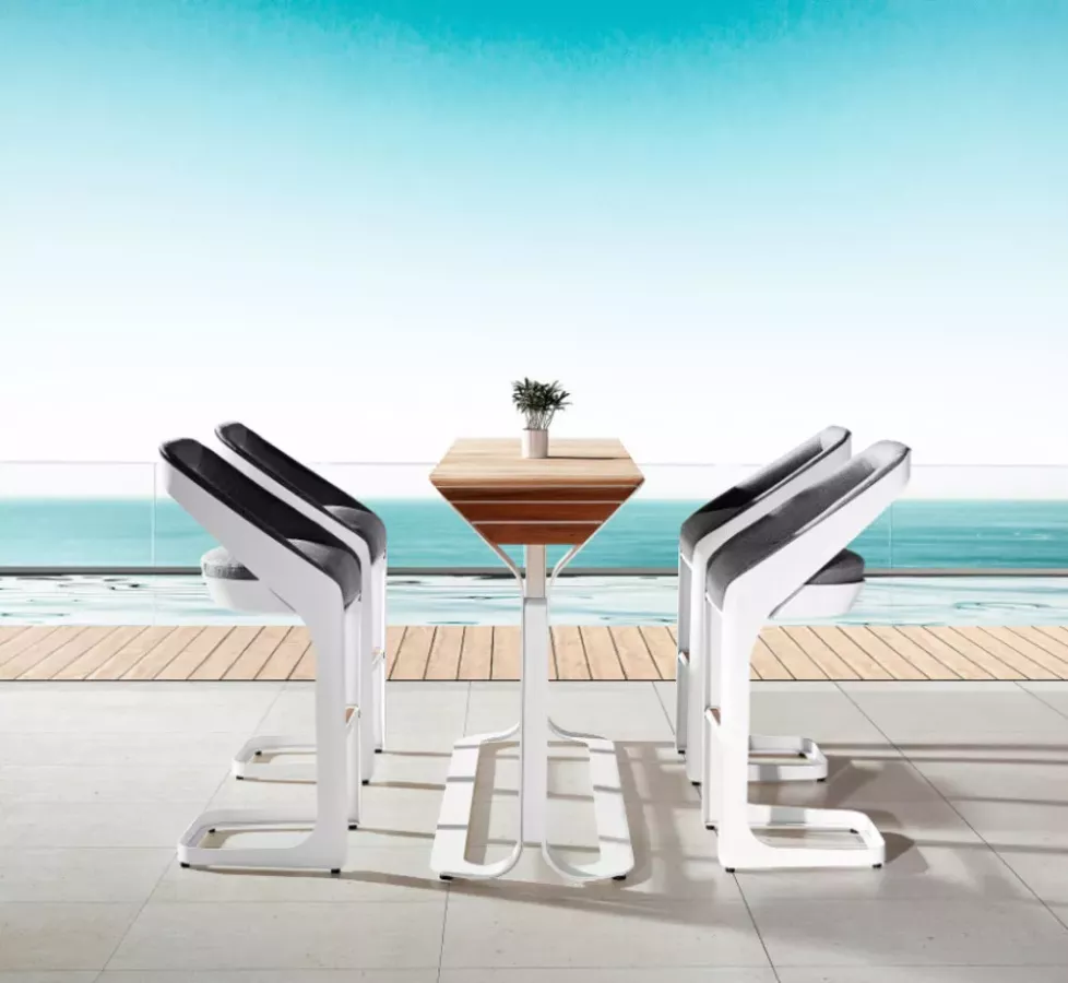 Le bar ONDA by Pininfarina se compose d’une table haute au design sculptural, avec un plateau en teck massif et une structure en aluminium thermolaqué de 8 mm avec platine inox, garantie 3 ans. Il est accompagné de 4 tabourets en aluminium 6 mm, avec assise en tissu Sunbrella® et mousse Quick Dry Foam, alliant confort et robustesse pour un usage en extérieur.