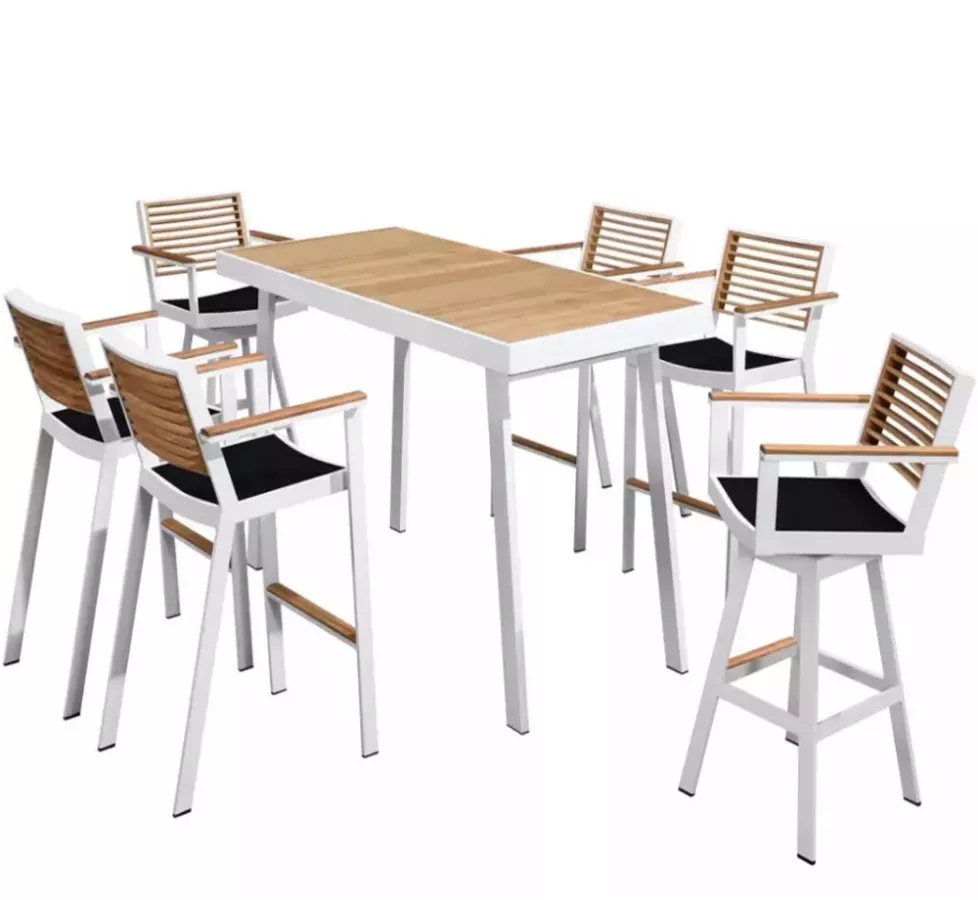 Profitez de chaque moment en extérieur avec style et confort grâce à l’ensemble bar YORK. Conçu pour sublimer les terrasses contemporaines, les jardins avec vue ou les rooftops ensoleillés, cet ensemble haut de gamme se compose d’une table haute en teck massif avec structure en aluminium thermolaqué, accompagnée de deux fauteuils pivotants et de quatre chaises de bar. Une invitation à partager un déjeuner en famille, un apéritif entre amis ou simplement savourer un café face à la mer.