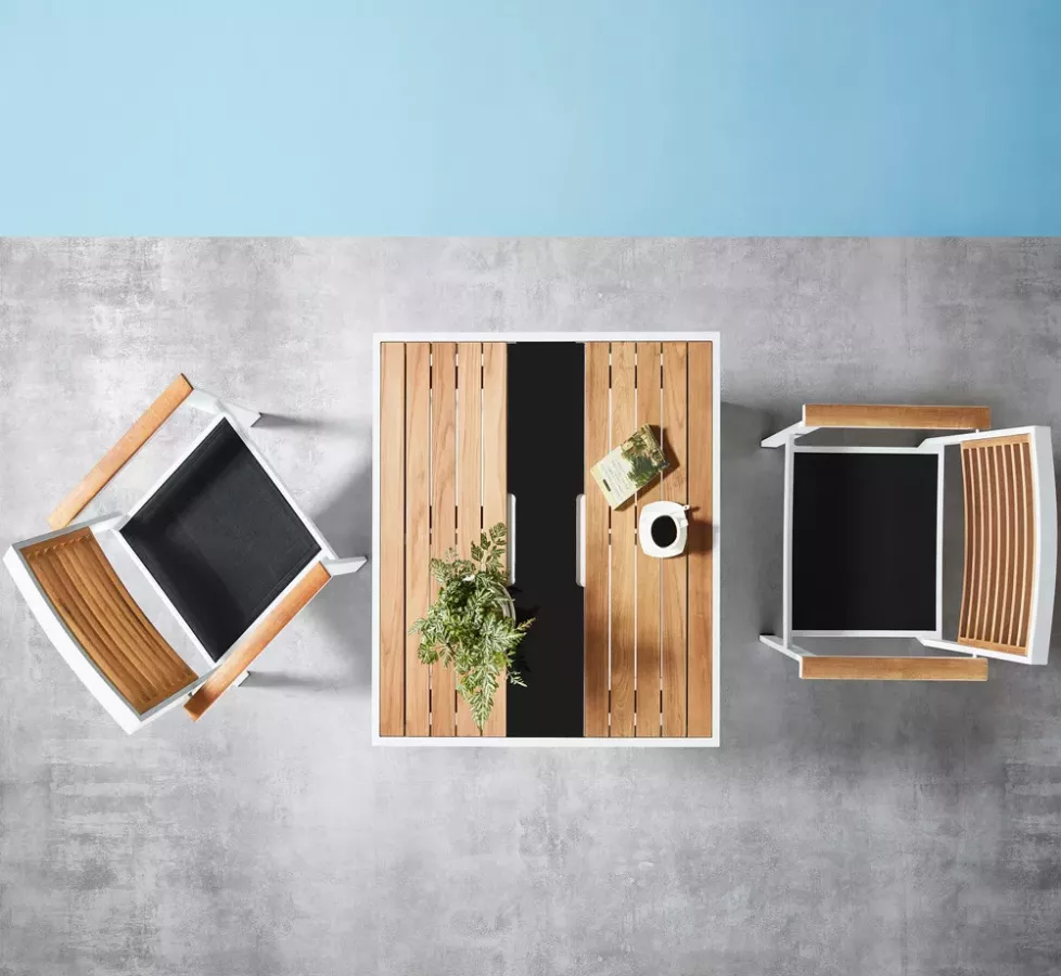 Au cœur de cet ensemble : une table carrée de 90 × 90 cm, avec une structure en aluminium blanc, légère et résistante, et un plateau en teck massif de 12 mm d’épaisseur, reconnu pour sa robustesse naturelle et son élégance intemporelle. En son centre, un bac encastré en verre trempé noir sérigraphié (épaisseur 5 mm) apporte une touche graphique sophistiquée tout en étant parfaitement fonctionnel.