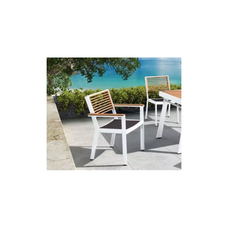 L’ensemble comprend deux fauteuils (82 × 64 × 108 cm) et deux chaises (82 × 52 × 108 cm), qui reprennent l’esthétique sobre et raffinée de la table. Leur structure en aluminium blanc garantit une excellente tenue dans le temps, sans rouille ni déformation. Les accoudoirs en teck naturel apportent une sensation chaleureuse et un contact agréable, tout en soulignant l’élégance naturelle de la ligne.
