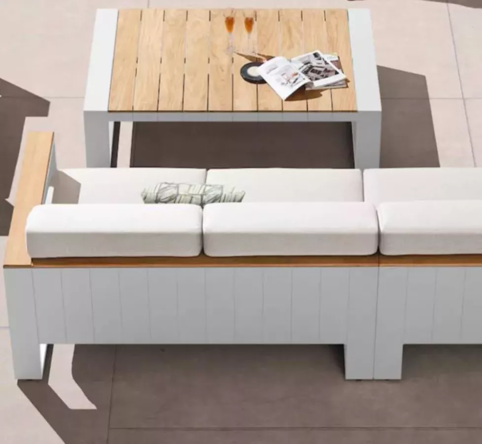 Les accoudoirs et le plateau de la table basse sont réalisés en teck massif Grade A, un bois noble et durable qui développe avec le temps une élégante patine argentée.