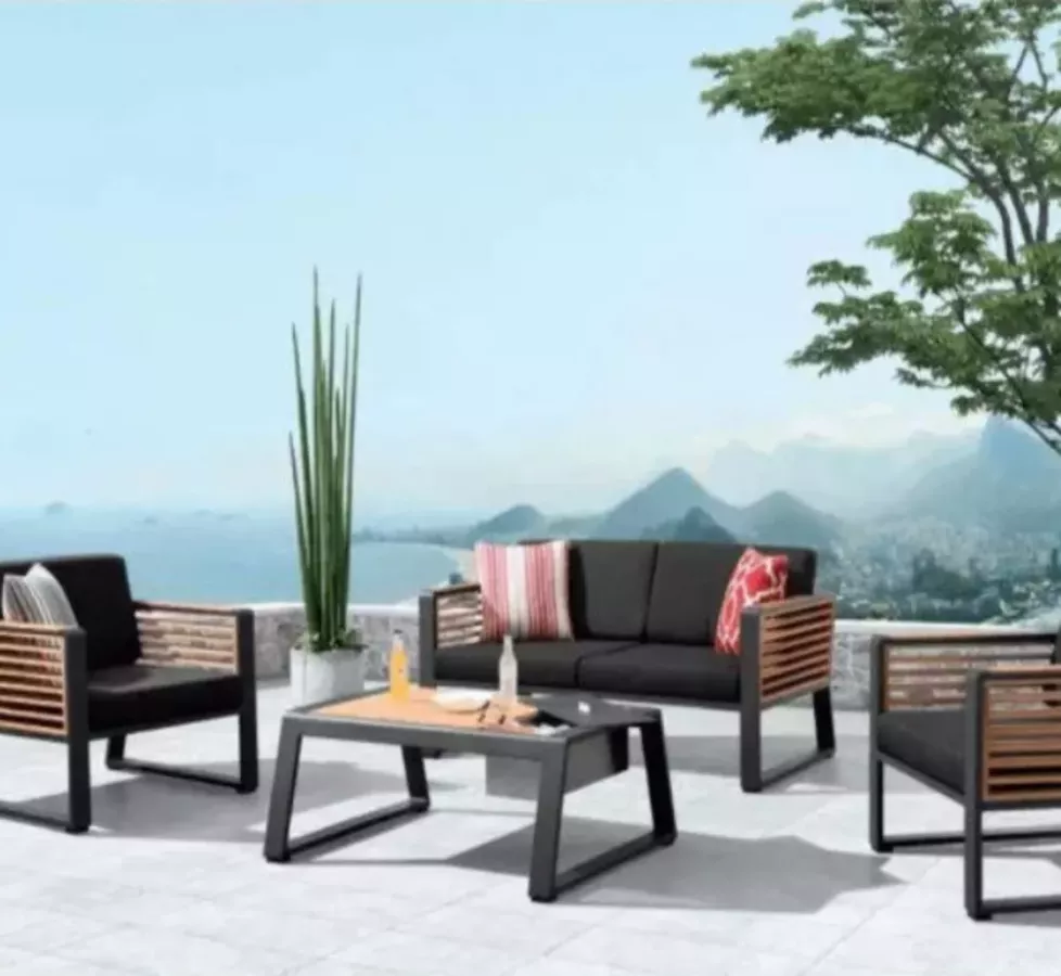 La structure en aluminium thermolaqué noir mat apporte légèreté, solidité et résistance extrême aux éléments, tandis que les accoudoirs en teck massif naturel confèrent au mobilier chaleur et raffinement.