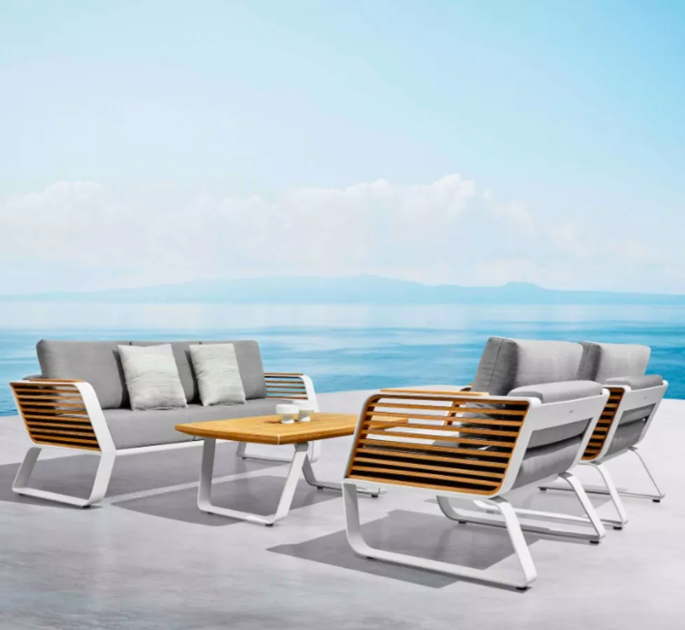 Grâce à un savoir-faire artisanal minutieux et à une technologie de pointe, l’ensemble se distingue par sa structure en aluminium de haute qualité. Cet aluminium massif de 8 mm, initialement développé pour les navettes spatiales, confère à chaque pièce des lignes dynamiques, robustes et élégantes, tout en assurant une durabilité exceptionnelle. Des accents en teck naturel A-Class provenant du Myanmar apportent une touche noble et chaleureuse, idéale pour résister aux aléas du temps.