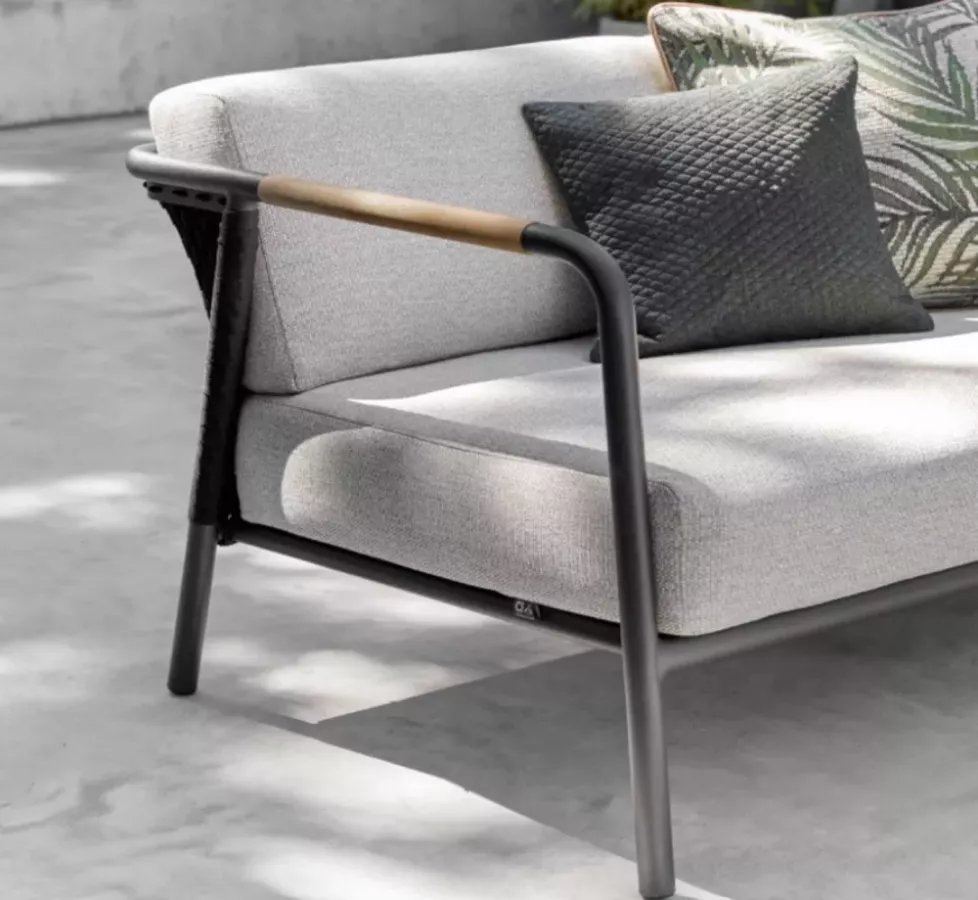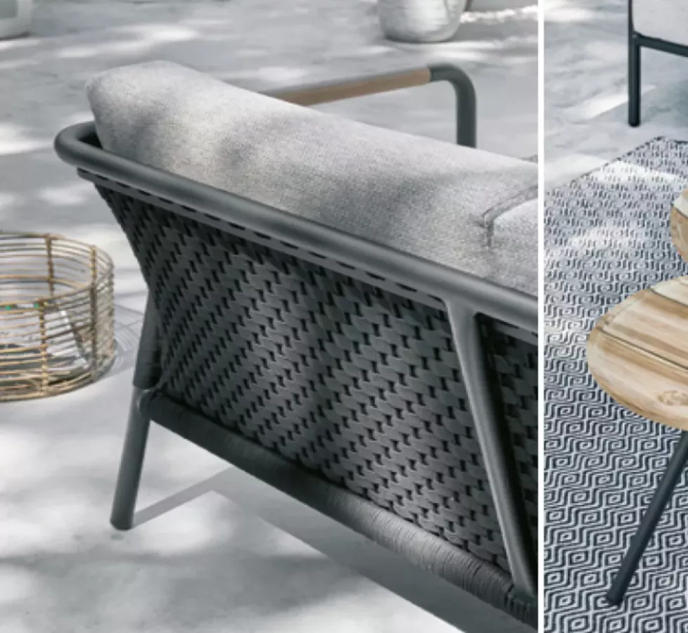 Le salon ELLE séduit par ses lignes épurées, sa silhouette géométrique et ses proportions équilibrées. Sa structure en aluminium thermolaqué noir mat apporte une touche de modernité discrète, tout en garantissant légèreté, robustesse et durabilité. Résistante à la corrosion et aux intempéries, cette structure est parfaitement adaptée à une installation permanente en extérieur, même en bord de mer.