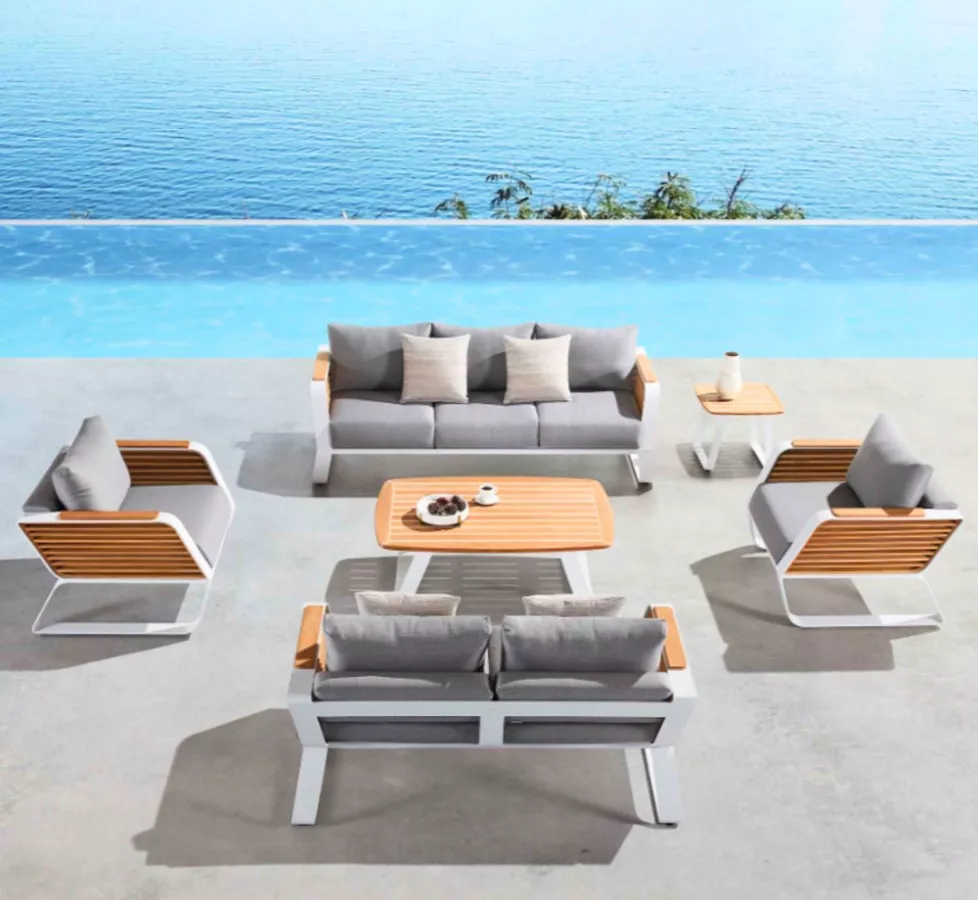 Le plateau de la table est réalisé en teck naturel, un bois noble et durable, reconnu pour sa résistance aux intempéries et son aspect chaleureux qui évolue magnifiquement avec le temps. Le teck, issu de forêts certifiées, apporte non seulement une élégance intemporelle, mais aussi une robustesse qui assure la pérennité de votre mobilier. Le mariage de l’aluminium et du teck crée un contraste raffiné entre modernité et tradition, conférant à la table une allure à la fois contemporaine et authentique.